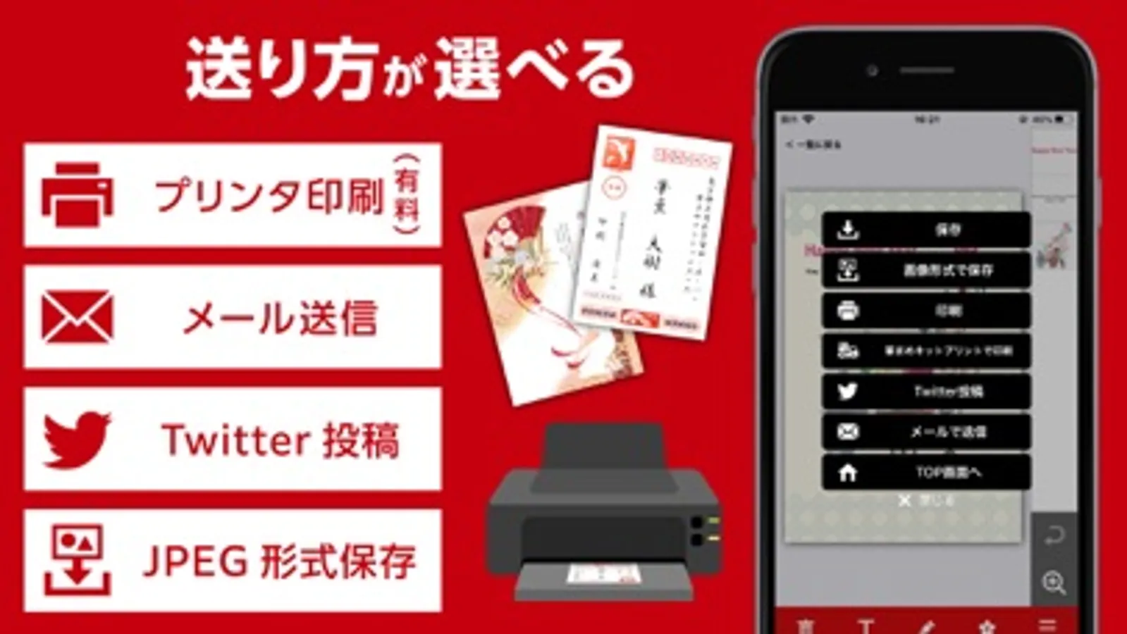 作成した年賀状は、有料の拡張機能で家庭用プリンタから印刷できます。また、メール送信やTwitter投稿ができるので、作ったデザインをすぐに共有できます。