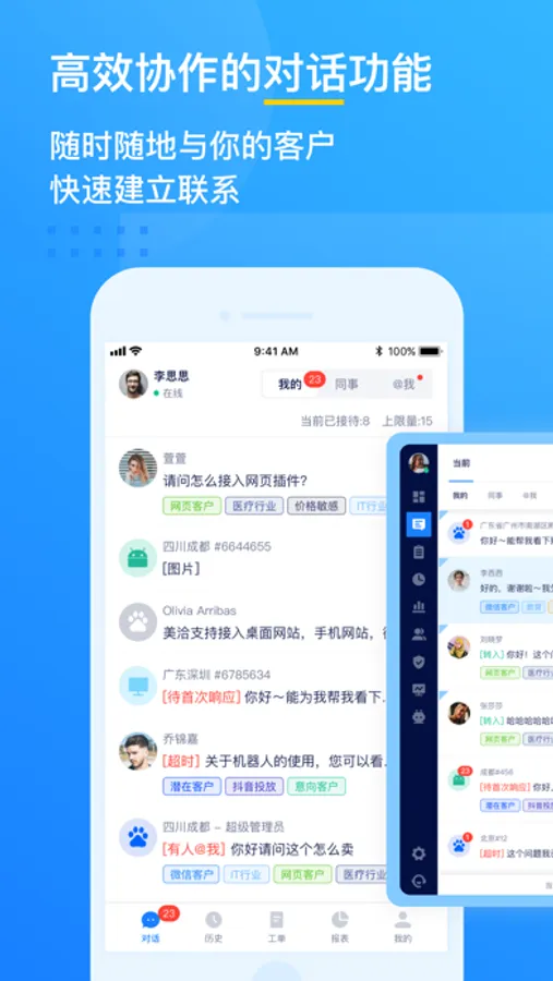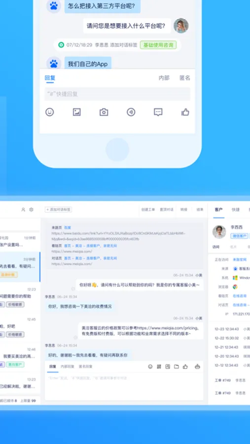 美洽在线客服是一款在线客服产品,提供一站式客户互动SaaS服务;目前美洽拥有在线客服、呼叫中心、客服机器人、工单系统和营销机器人、营销触达等产品,致力于帮助企业与客户的在线沟通互动场景效率提升,并提供一体化服务营销解决方案;目前美洽服务企业用户已超过30万家,覆盖互联网软件、教育培训、医疗、电子商务、金融、生活服务和房地产等行业领域。