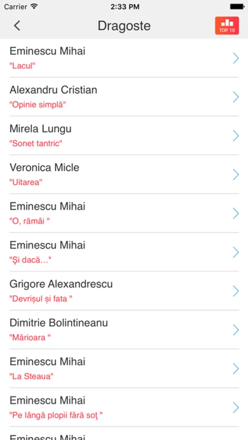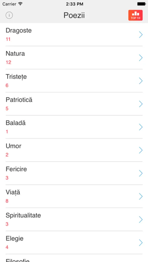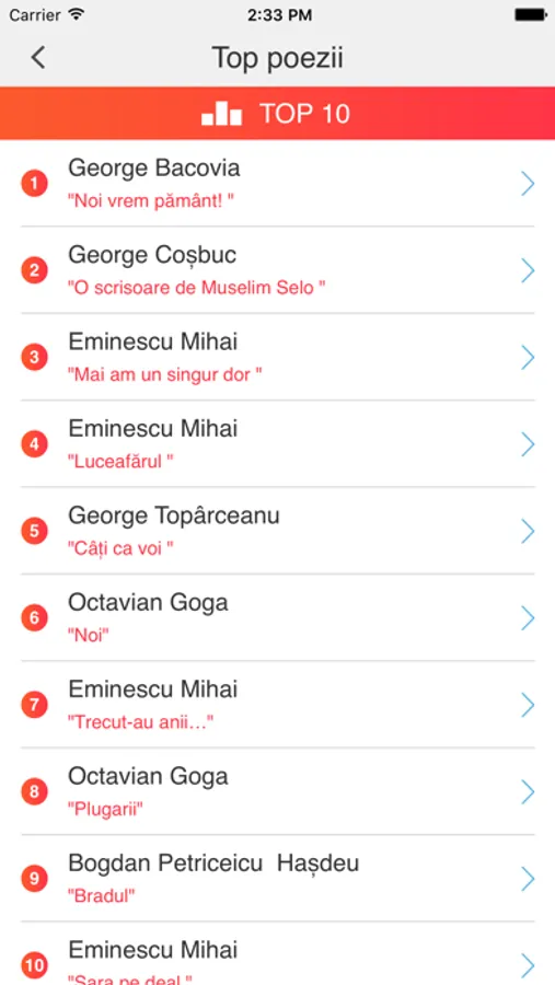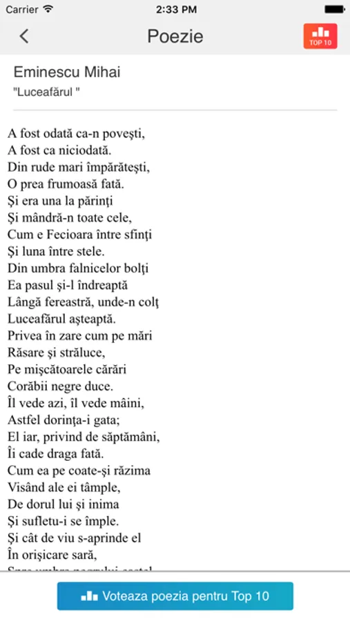 Aplicata POEZII, destinata comunitatii poetilor si cititorilor de poezie din Romania, functioneaza ca un TOP 10. Printr-un simplu touch poti cauta printre sute de poeme ale clasicilor sau contemporanilor cele potrivite sufletelului tau. Chiar te indemnam sa votezi. Gusturile, ca si vremurile, se schimba. Valoarea insa ramane aceeasi. Oricare scriitor poate sa-si posteze creatia literara si sa indemne fanii sa-i voteze opera. Un administrator va valida cererea. Apoi, isi va indemna fanii sa descarce aplicatia. Doar utilizatorii aplicatiei pot participa la competitie. Poetii pot ramane boemi, fara acces la noile tehnologii, dar fanii trebuie sa fie obligatoriu conectati. Asa-i dinamica lumii.