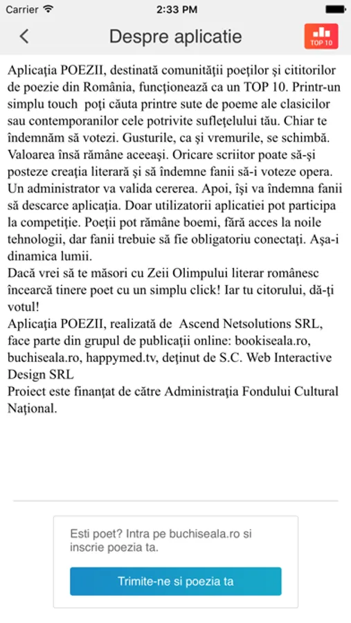 Aplicatia POEZII, realizata de Ascend Netsolutions SRL, face parte din grupul de publicatii online: bookiseala.ro, buchiseala.ro, happymed.tv, detinut de S.C. Web Interactive Design SRL.