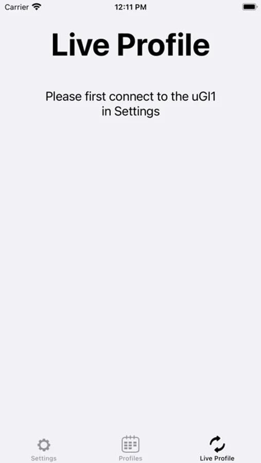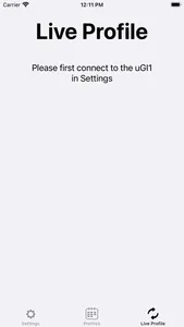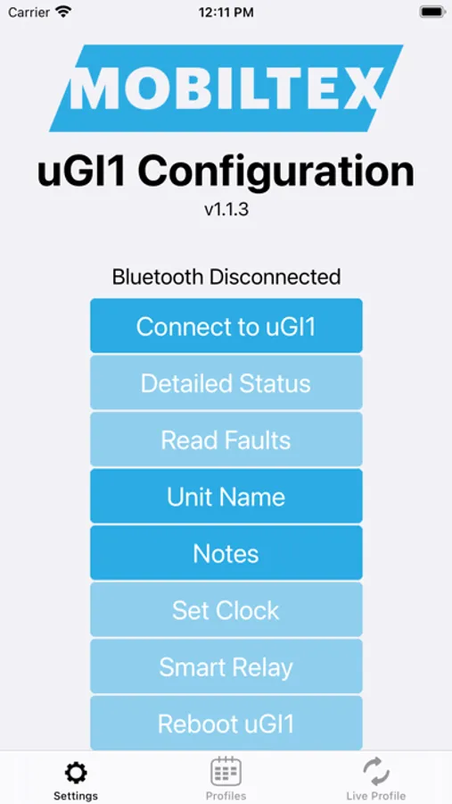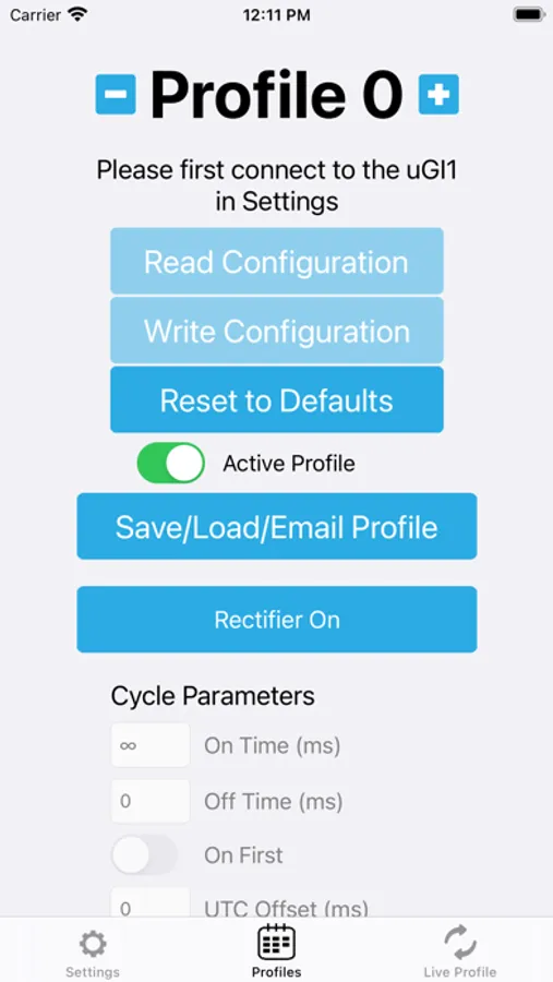 The app has three tabs, a 'Settings' tab, 'Profiles' tab and 'Live Profile' tab. The 'Settings' tab allows for seeing a detailed status of the device, any recent faults that have arisen, manually setting the Real Time Clock (RTC), setting the unit's name, adding notes and rebooting the device. The 'Profiles' tab allows for the custom configuration of up to 10 independent profiles. It can read/write them from/to the unit and set their values. In addition, the profiles can be reset to their default values. The 'Live Profile' tab gives real time live information on the uGI1 Profile.
