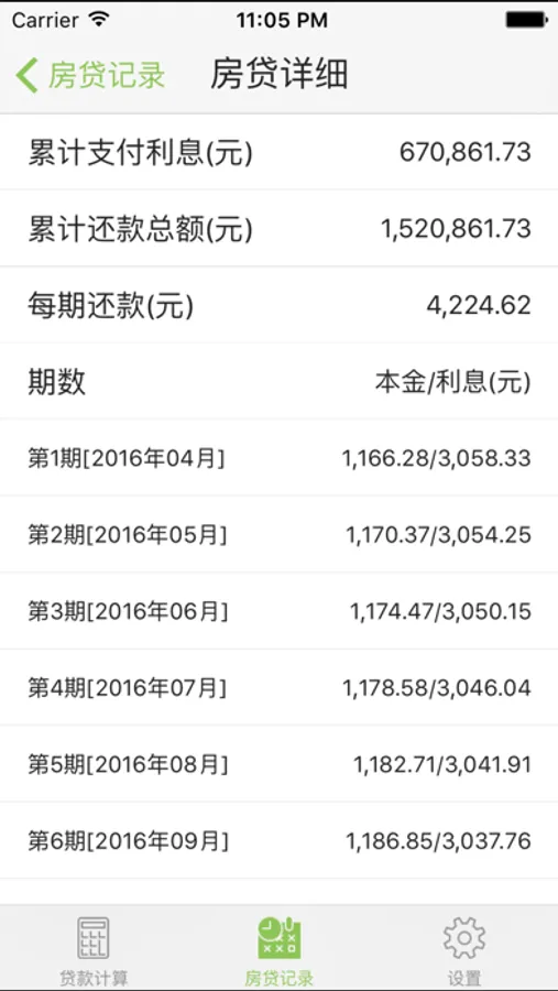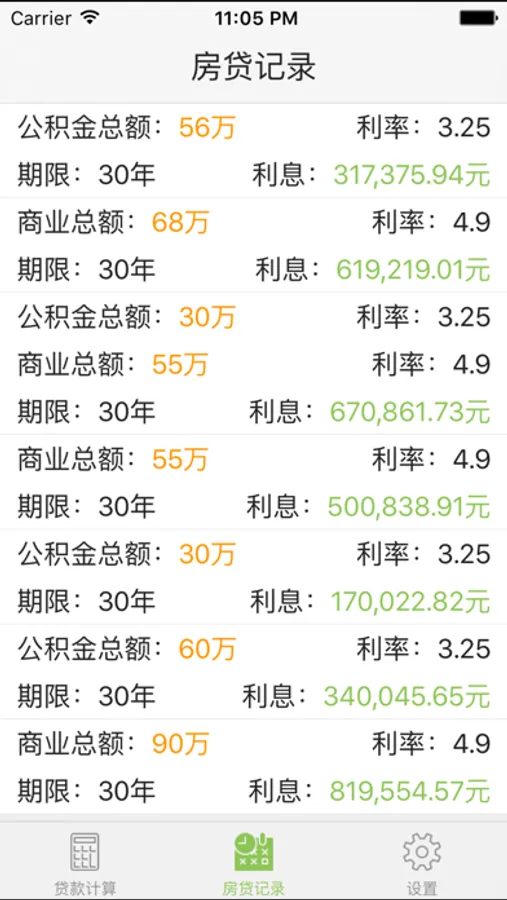 * 房贷记录列表,可以将房贷计算结果加入贷款记录,方便免计算直接查询记录的贷款方案。