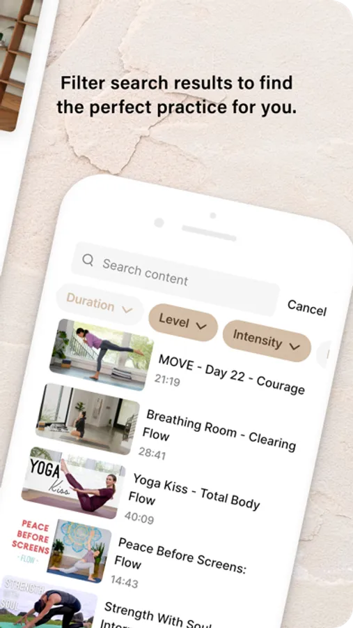 - Search with filters to find just the right video for whatever need you have, whatever mood you might be in, and in the time frame you have available to practice