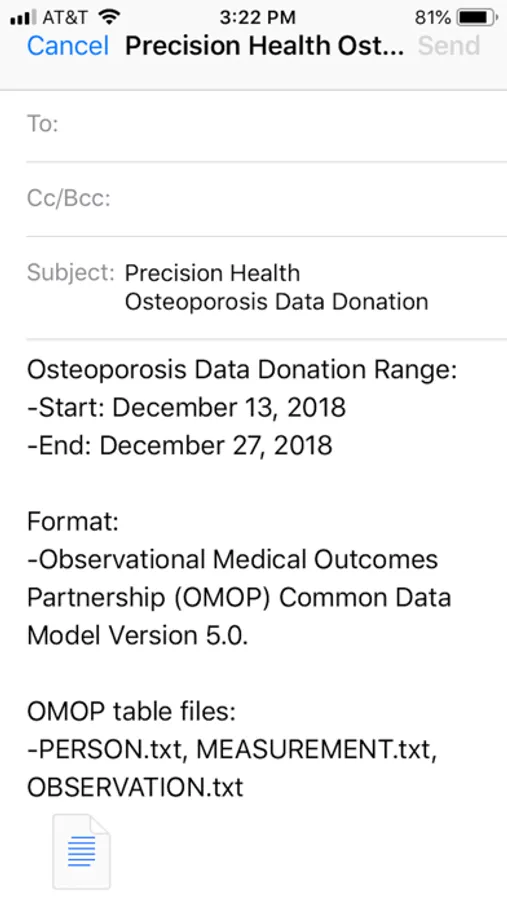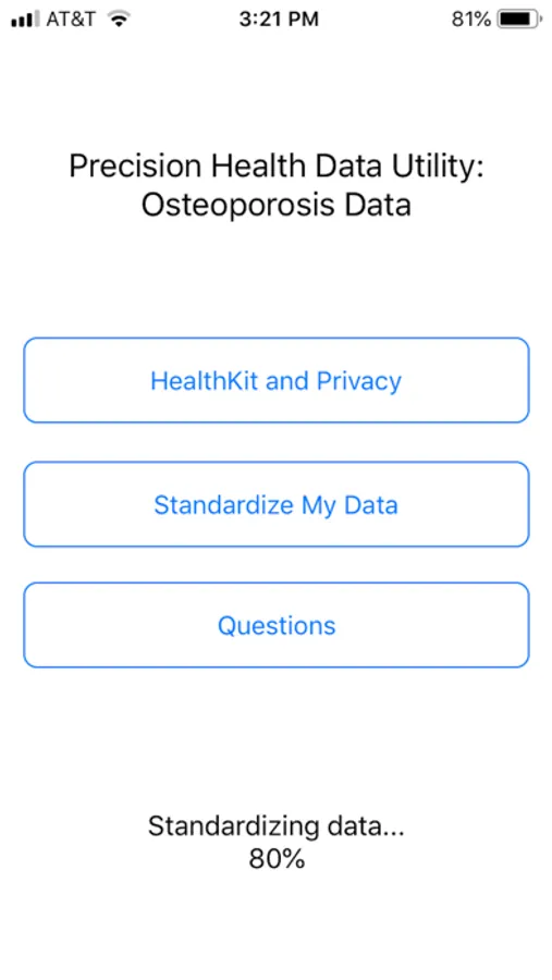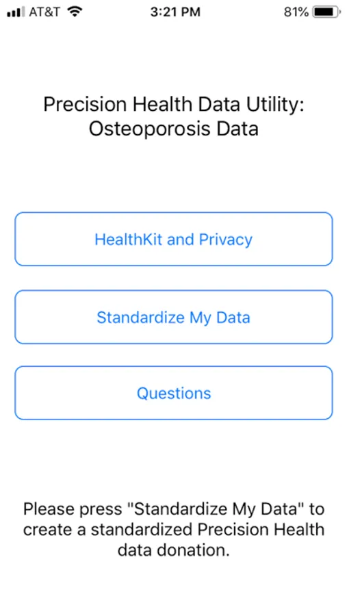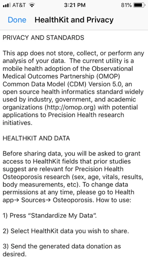 Precision Health initiatives will require research that not only uses a person’s clinical and genomic data, but their mobile health (mHealth) data as well. This app leverages HealthKit and integrates with the Health app to help Precision Health organizations build a standardized Precision Health mHealth database for Osteoporosis research. It is a simple utility that lets people choose baseline Health app data they wish to share, creates standardized (OMOP CDM v5.0) files that Precision Health researchers can understand, and allows them to email their donation to any Precision Health Osteoporosis project of their choosing. Before sharing data, users will be prompted to grant access to specific HealthKit fields relevant for Osteoporosis research (sex, age, vitals, results, body measurements, etc).