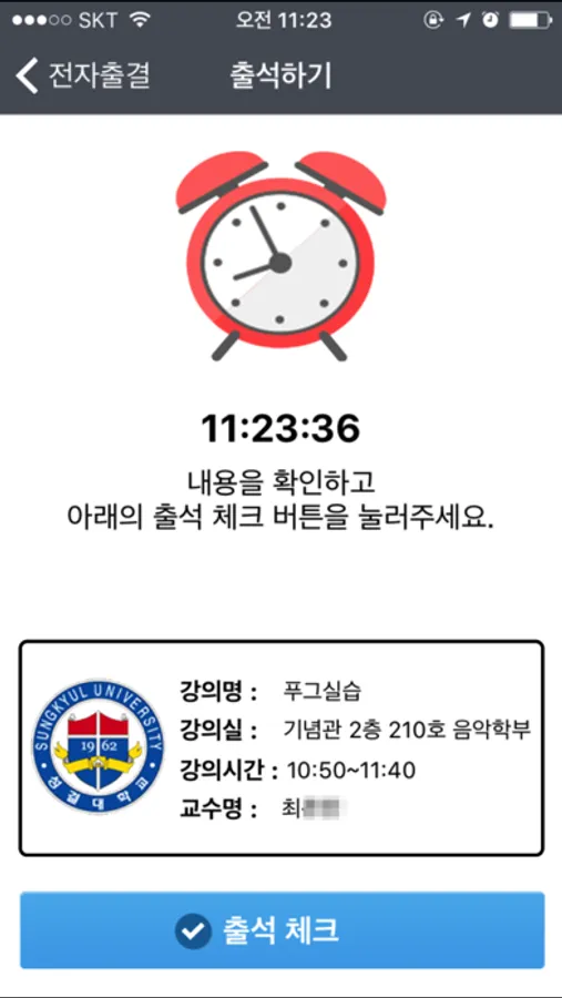 모바일 전자출결 앱을 활용하여 학생은 시간표를 토대로 강의 출석을 하실 수 있으며,