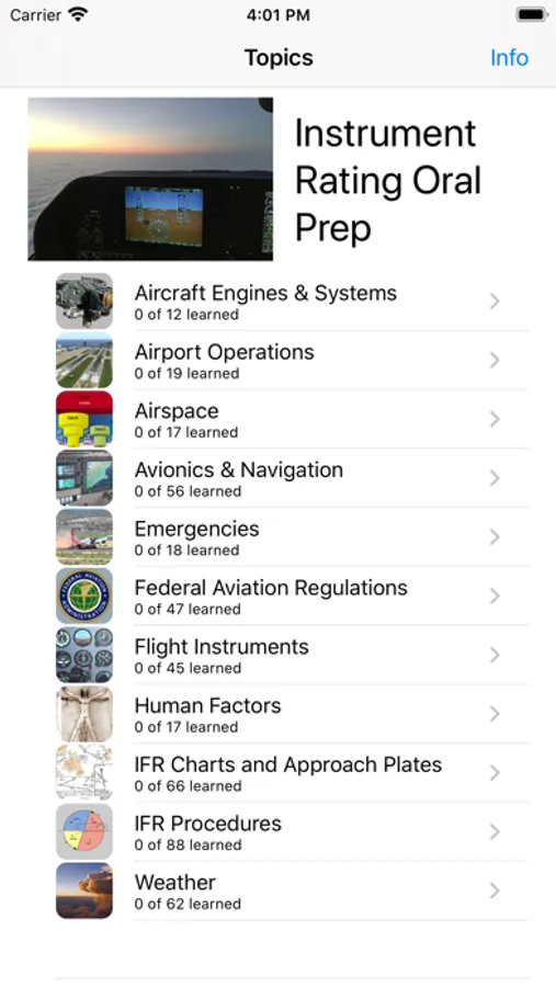The topics included are aircraft engines & systems, airport operations, airspace, avionics & navigation, emergencies, federal aviation regulations, flight instruments, human factors, IFR charts & approach plates, IFR procedures and weather.