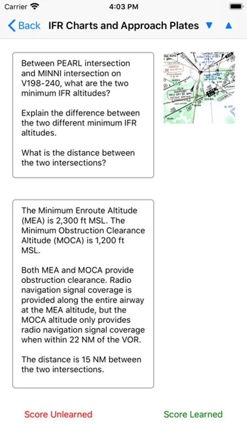 Questions are presented in flashcard style. Graphical images are provided when needed. When the student views the suggested answer, they can indicate if they answered satisfactorily or if they would like to review the question again. Learning all of the questions allows the student to be prepared and confident for the FAA Instrument Rating Practical Test.