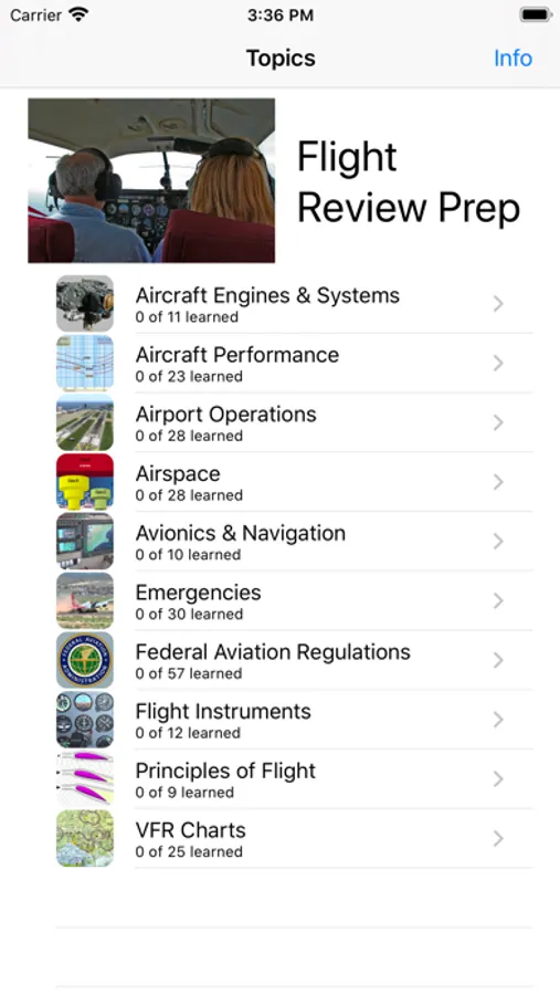 Preparing for a Flight Review can be difficult because it requires a broad overview of the current general operating and flight rules as well as other topics at the discretion of the flight instructor. Flight Review Prep includes over 220 common questions with suggested answers. The pilot can select one of 10 topics for each study session.