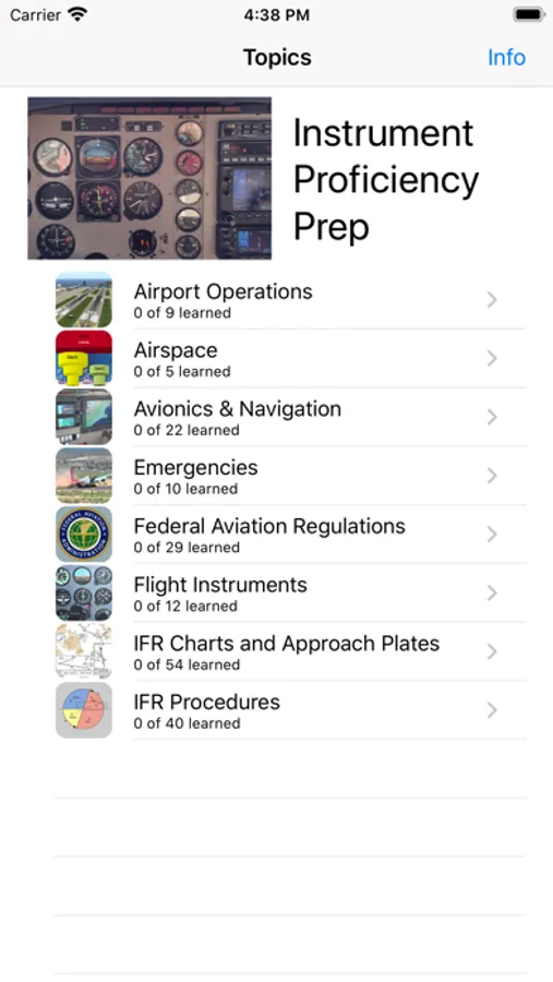 The topics included are airport operations, avionics & navigation, emergencies, federal aviation regulations, flight instruments, IFR charts & approach plates and IFR procedures.