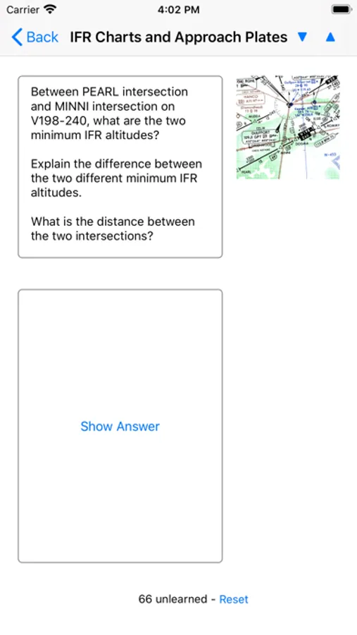 Questions are presented in flashcard style. Graphical images are provided when needed. When the pilot views the suggested answer, they can indicate if they answered satisfactorily or if they would like to review the question again. Learning all of the questions allows the pilot to be prepared and confident for the knowledge needed for the FAA Instrument Proficiency Check.