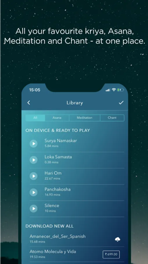 - Play any meditation or chants or asana without creating a playlist through all new Play one-offs feature.