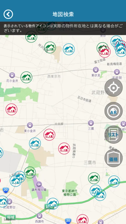 ◆ GPS情報を利用した地図検索が可能です。地図上に物件アイコンが表示され、地図を指でなぞることで、住みたい街周辺に移動し、物件アイコンを選択することで物件情報を確認できます。