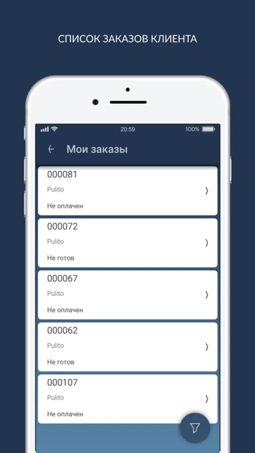 - посмотреть свои заказы в работе, их статусы, историю заказов;