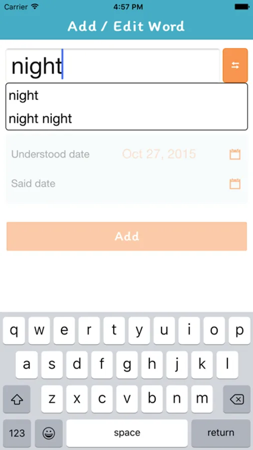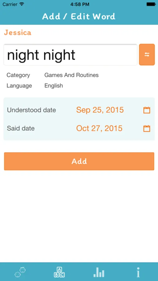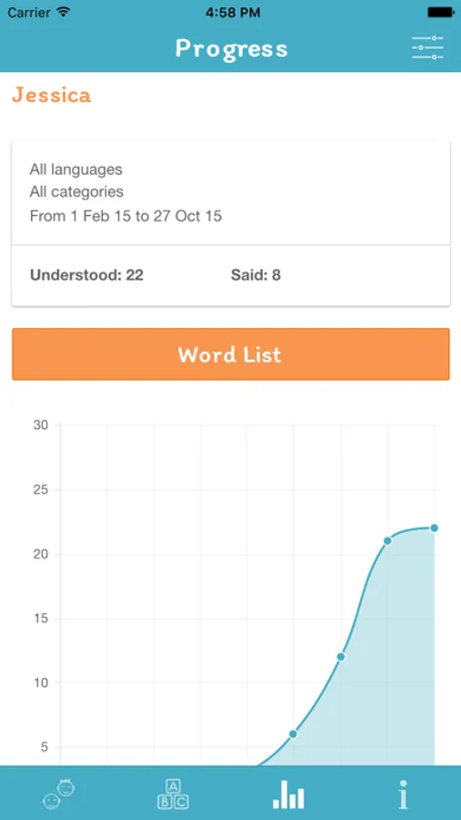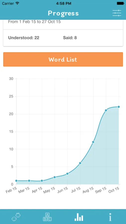 The app allows you to enter when your child displays understanding and says specified words. It then allows you to view statistics and graphs of their language development.