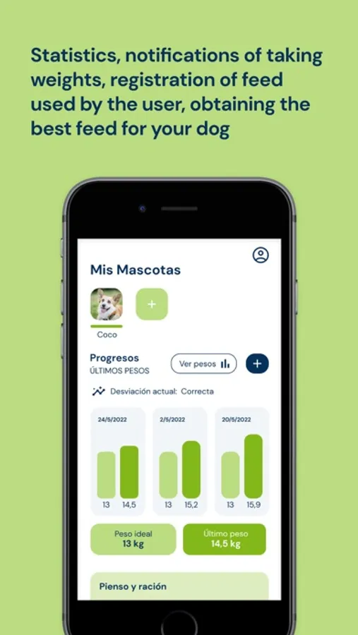 NutriPetdog includes statistics, weight announcements, the best recomended feed and the optimal ration to achieve the ideal weight of your dog.