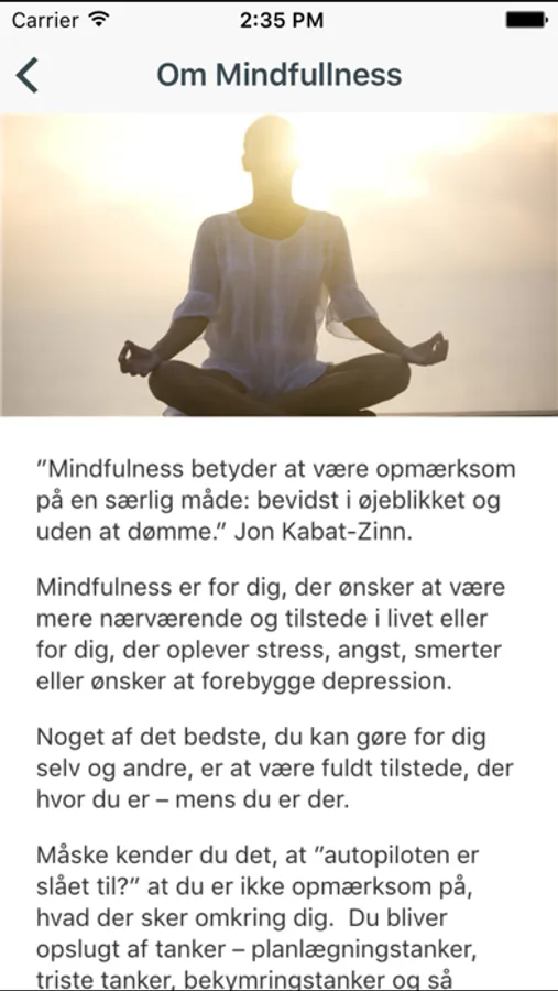 App’en har stor brugervenlighed og indeholder over 10 timers lydfiler. App’en er indtalt på dansk og kan anvendes af alle med både stor eller ingen erfaring med meditation.