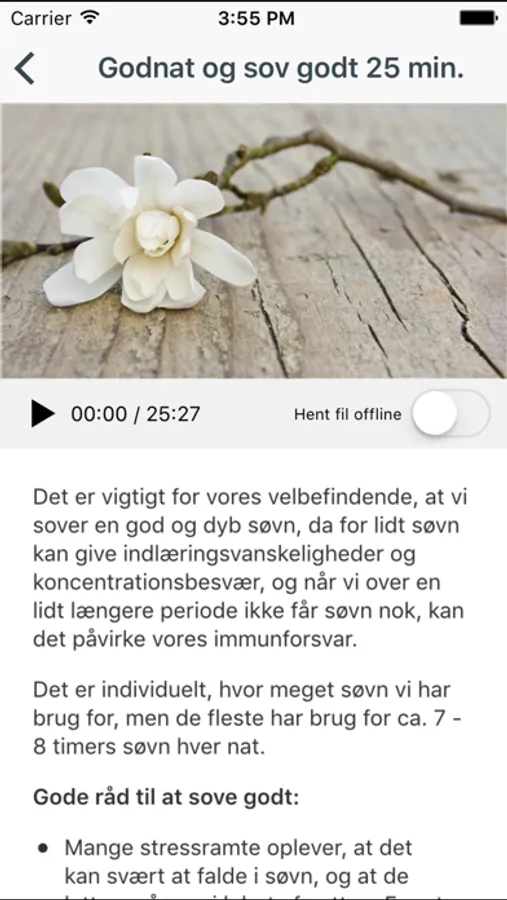 Endvidere er app’en udstyret med en “hent til offline” funktion, hvilket gør det muligt at hente lydfilerne, så det ikke længere er nødvendigt at have internetforbindelse. Dette giver god mulighed for at tage app’en med i sommerhuset, på ferie, i flyet eller andre steder på farten.