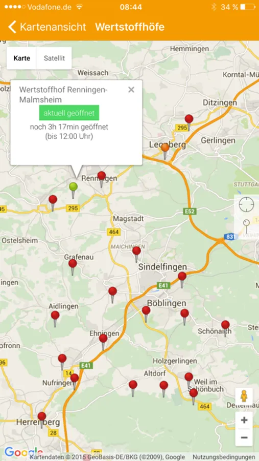 - Abfallkompass: Kartenansicht der Entsorgungseinrichtungen wie z. B. Wertstoffhöfe, Häckselplätze und Containerstandorte mit dazugehörigen Öffnungszeiten