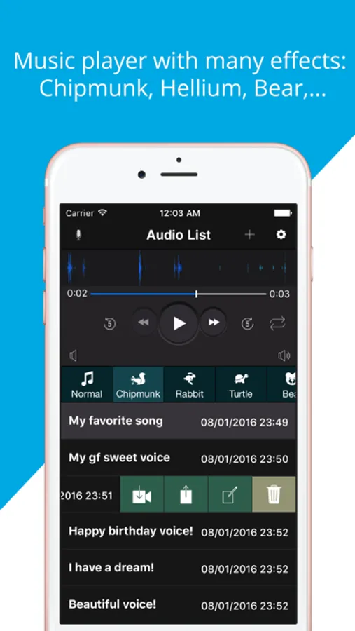 → Import any audio file and play as Chipmunk, Rabit, Turtle,... voice