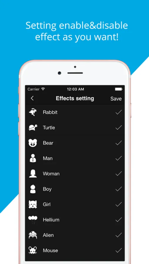 → Play with many effects: Chipmunk, Rabbit, Turtle, Bear, Man, Woman, Girl, Boy, Hellium, Alien, Mouse, Flash (Email developer for requesting more effects)