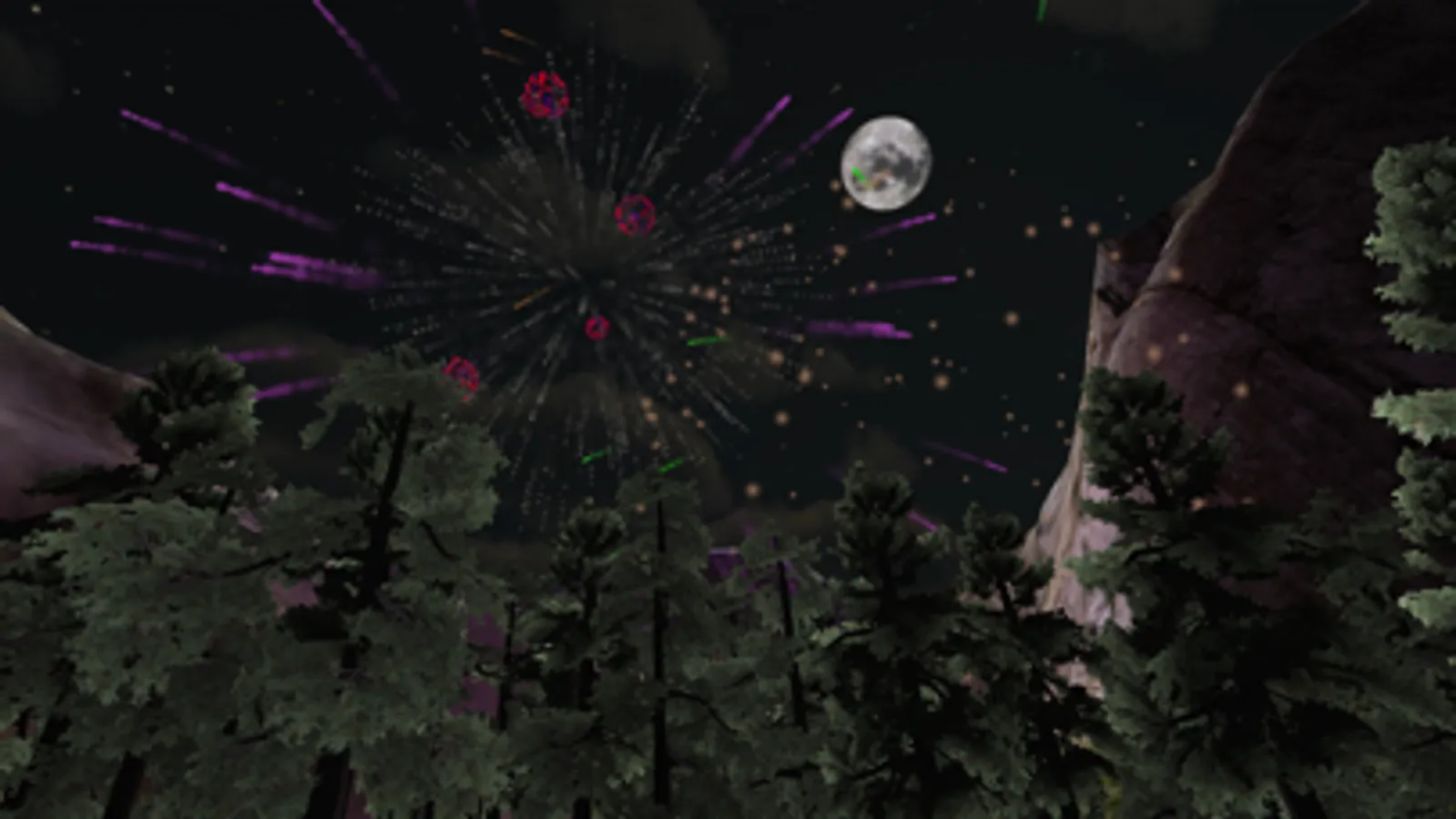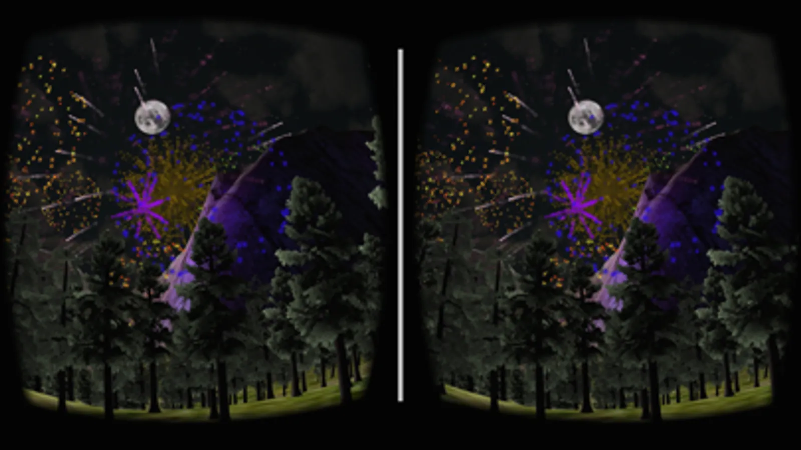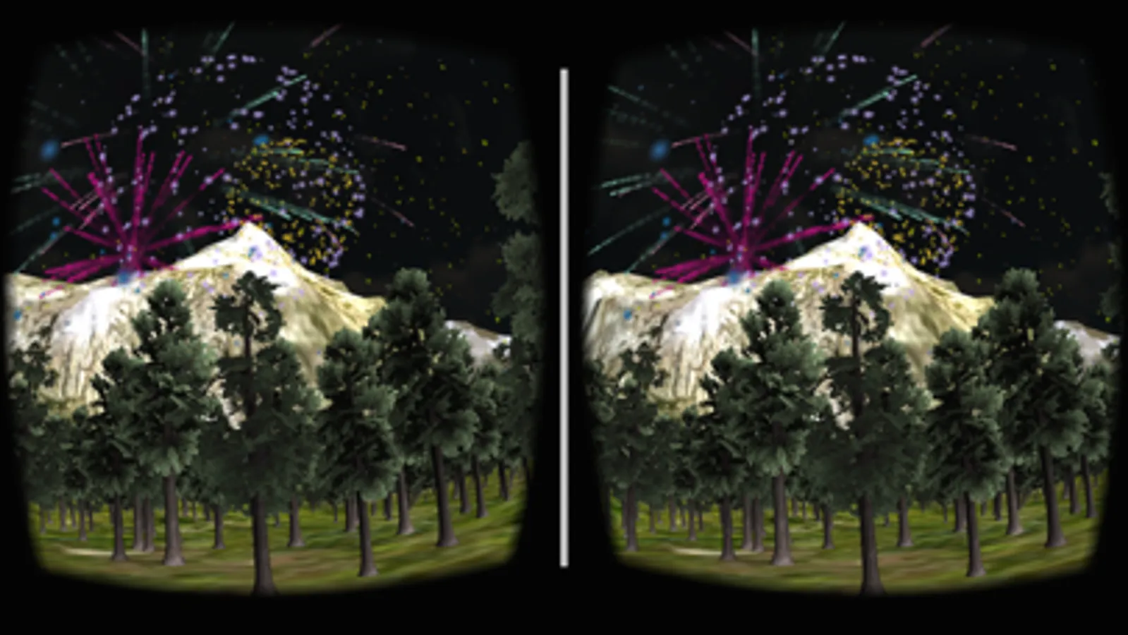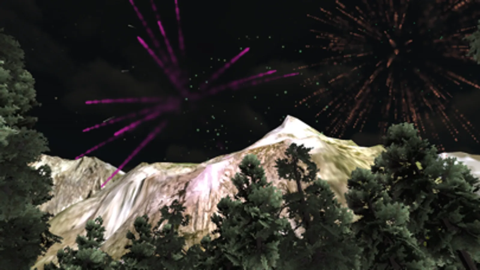 Enjoy full 3D immersion as you watch fireworks explode in a beautiful valley surrounded by trees and mountain peaks.
