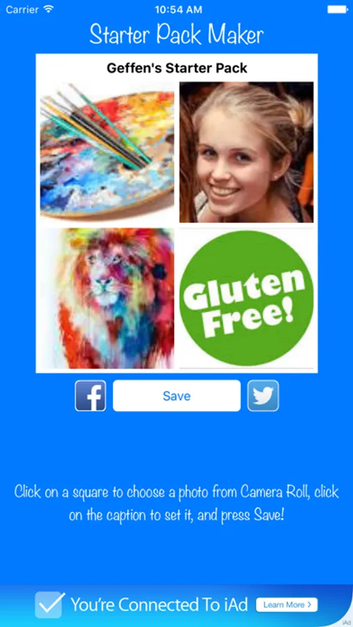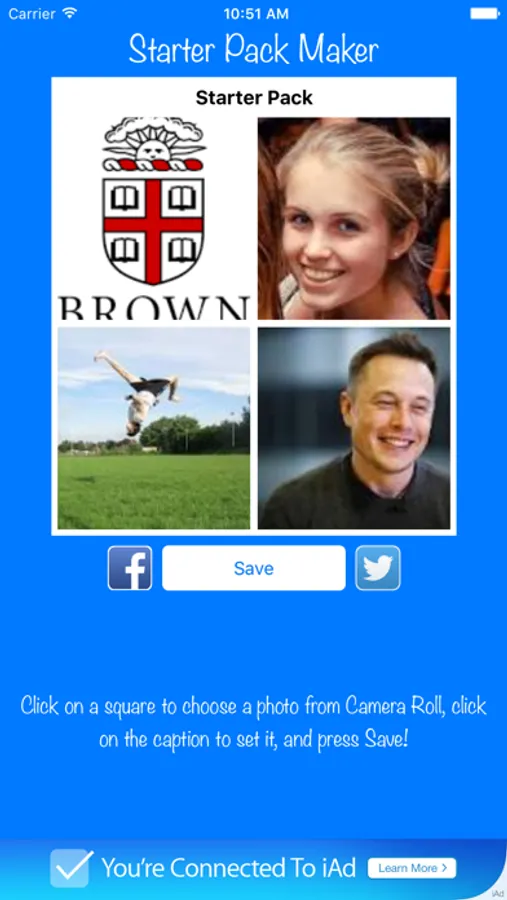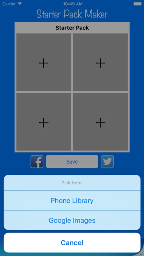 In this app you can create your own Starter Packs for your friends and family! Add images to the Starter Pack from your camera roll or directly from Google image search, set the caption, and download the generated multi-panel photo set to your camera roll or share it directly to Facebook or Twitter.