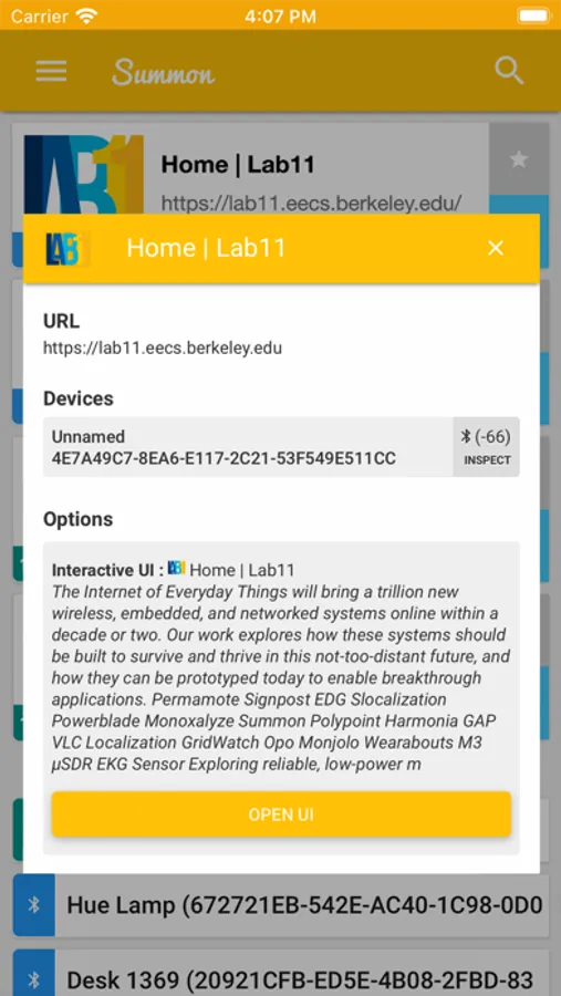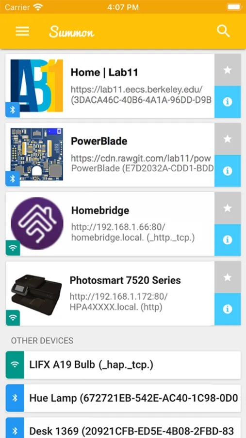 Summon is a service for discovering nearby URL-associated Bluetooth devices and Bonjour/mDNS services, enabling locally-relevant browsing in the Web of Things. To learn more about setting up compatible peripheral devices or about the overall Summon project, go to http://github.com/lab11/summon.