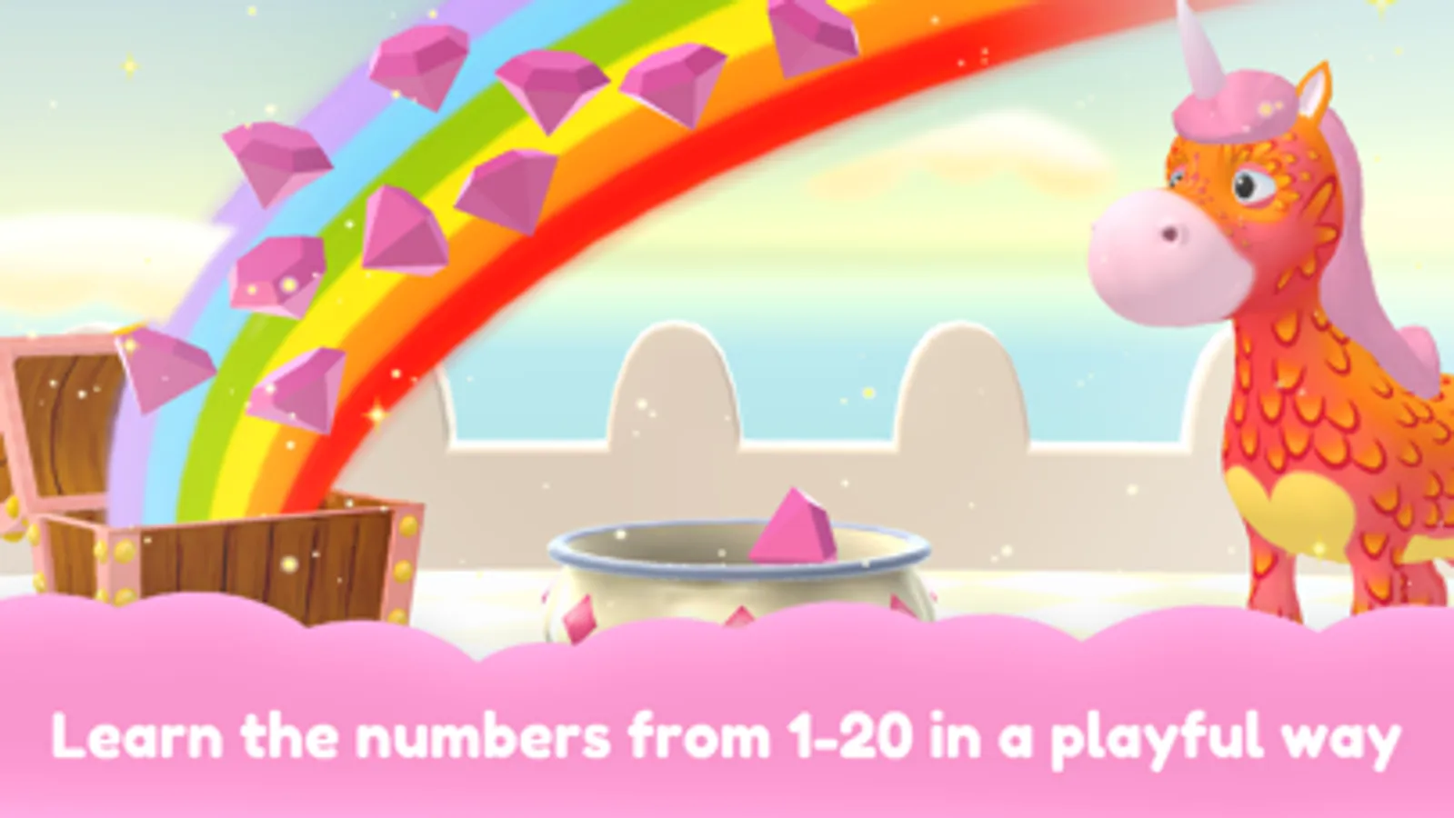 The ride through the worlds will be full of lovely surprises and your child's unicorn will even slide down a rainbow to reach the magic castle. With the help of the Unicorn your child will learn the numbers from 1-20 in a playful and fun way. And you can even switch between 14 different languages.