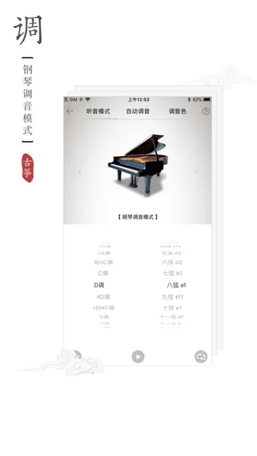 1、满足少数用户愿意使用三角钢琴调音的需求;2、在36簧高音笙音域之外的音,可选择跳转至“钢琴调音模式”下继续使用钢琴音源进行调音,如大阮4弦D(73.4hz)