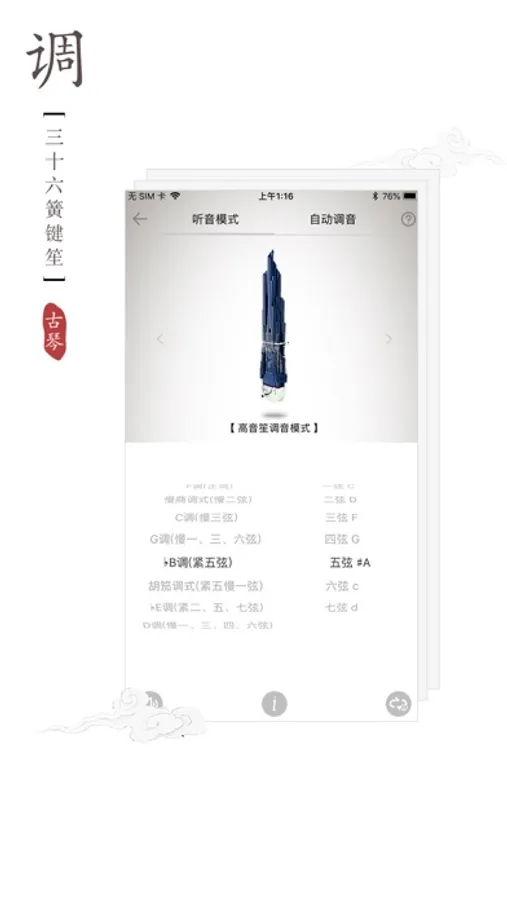 笙是整个乐队的“校音器”,因此笙的调律对乐队极为重要。App中的36簧高音笙是在精密的调律后,通过最为优秀的笙演奏家,为各类民族乐器吹奏校音所需的音频