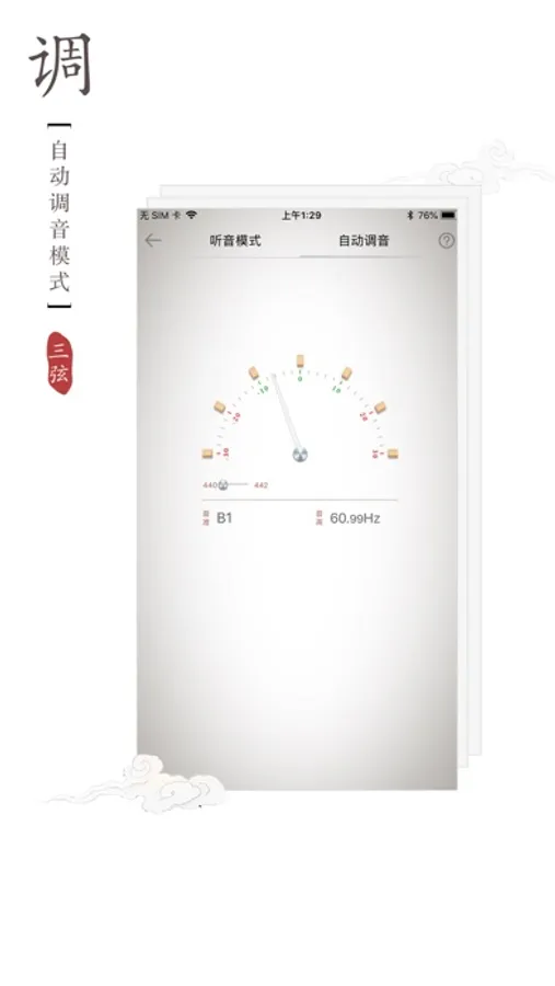 上述3种调音模式均通过听觉,与其不同的是,“自动调弦模式”实时监测音高,通过视觉观看仪表盘的偏转确定音的高低。指针指向原点则音准无误,偏右则音高,偏左则音低。您可点击右上角的帮助按钮,查看如何调整乐器和演奏技巧,以使音维持在准确音准的状态