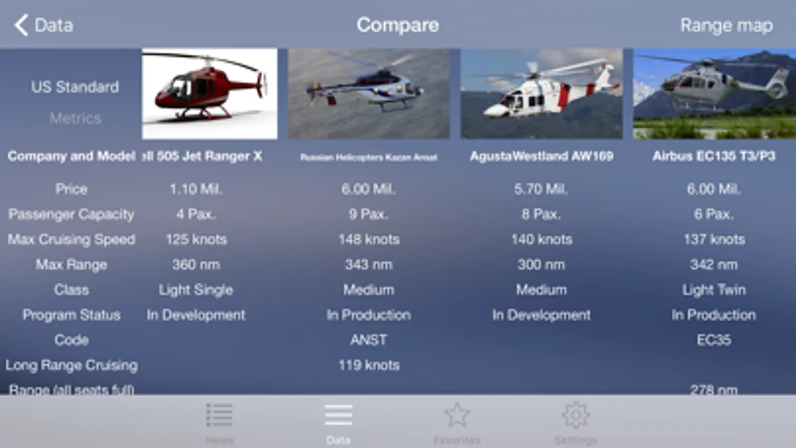 You can read about Jet, Turboprop and Piston model helicopters news and aviation news. You can sort and filter helicopters information based on more than 20 criteria and aviation metrics both on US Imperial or Metrics system.