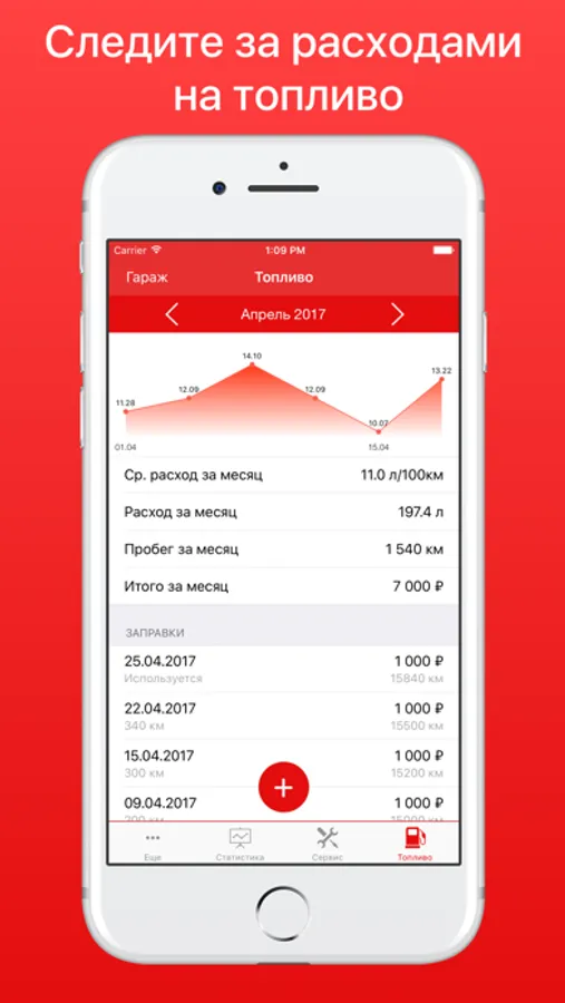 Добавляйте заправки и приложение рассчитает и наглядно покажет средний расход за день/месяц/год.