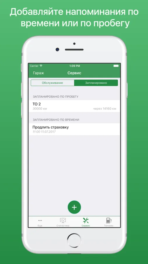 Добавляйте напоминания по пробегу и по времени и Вы никогда не забудете, что пришло время сделать ТО или продлить страховку.