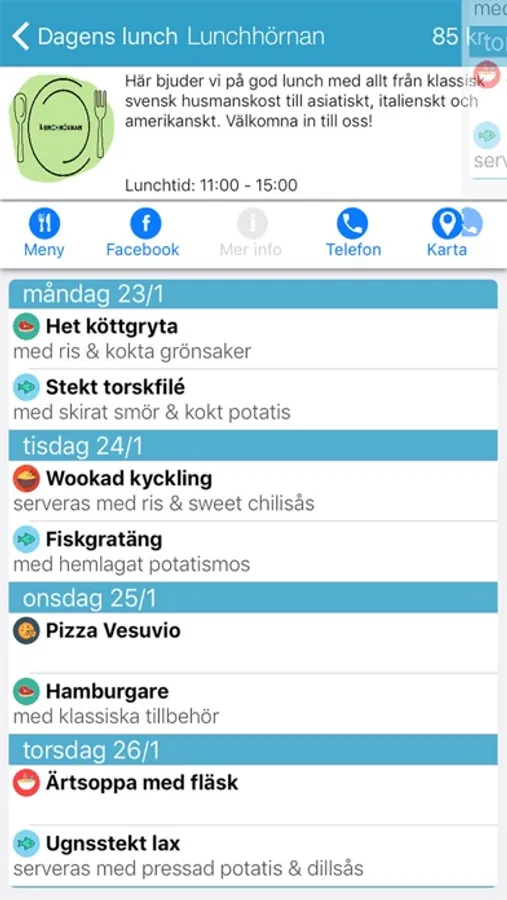 Förutom möjligheten att kunna se lunchmenyerna kan du hitta vart restaurangerna ligger, ringa dem och gå in på deras hemsida. Menyerna uppdateras varje vecka.