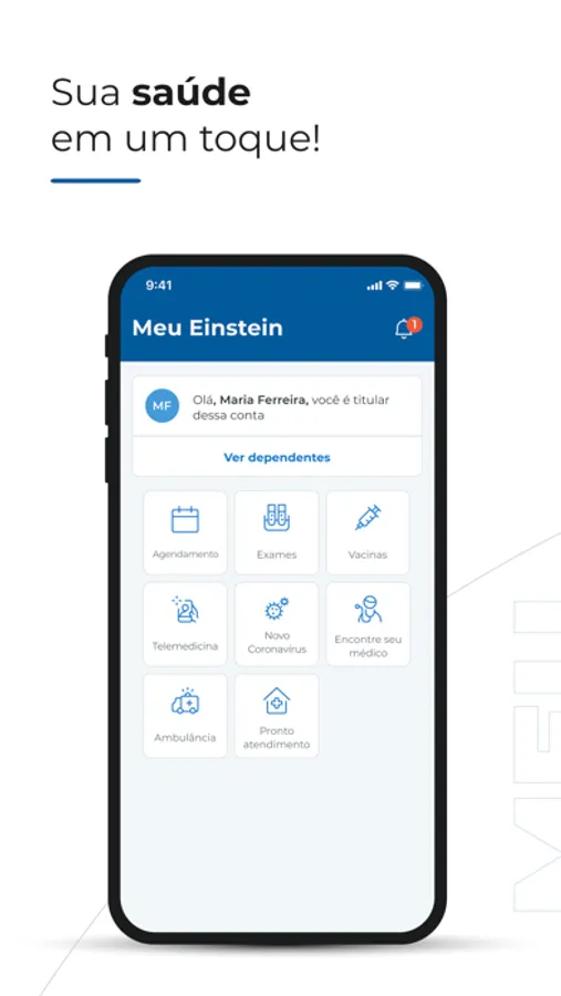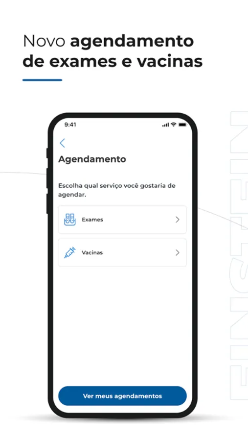 O aplicativo Meu Einstein oferece ao paciente Einstein a gestão da própria saúde na palma da sua mão. Através do aplicativo Meu Einstein você poderá acompanhar os registros de saúde de forma rápida e segura, além de simplificar o acesso a serviços prestados pela instituição. O aplicativo fornece grandes funcionalidades que visam facilitar a sua vida. Confira abaixo nossas funcionalidades: