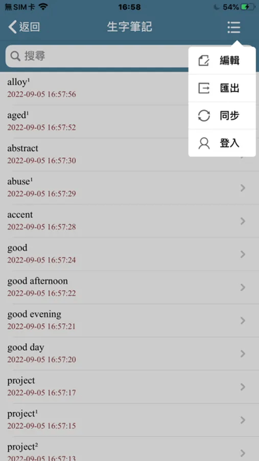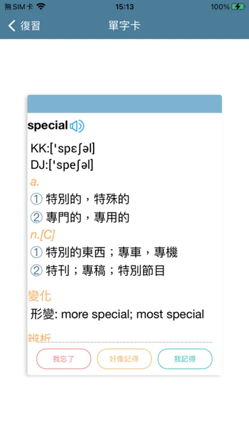 3. 簡單字義即時知:詞彙清單中不但列出關鍵字,並提供各關鍵字簡單字義,無需查詢即可知道相關單字基本解釋。