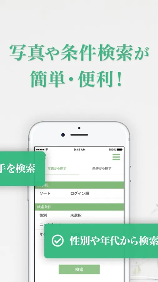 検索方法はシンプルで「こんなひと」というイメージで直感的に探せますし、画像で検索することもできます。普段マッチングアプリを使い慣れていない初心者にもやさしい設定になっています。