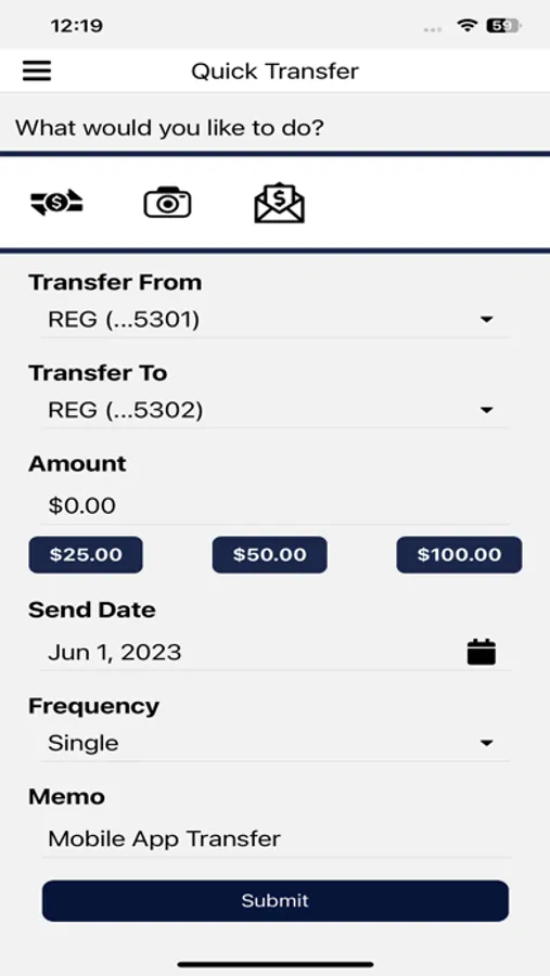 View account balances, see recent activity, transfer funds between accounts, and deposit checks by taking a picture of the front and back of the check.