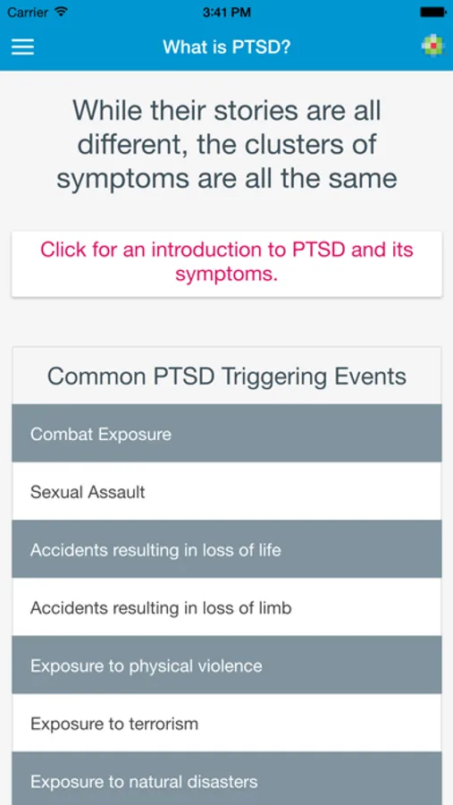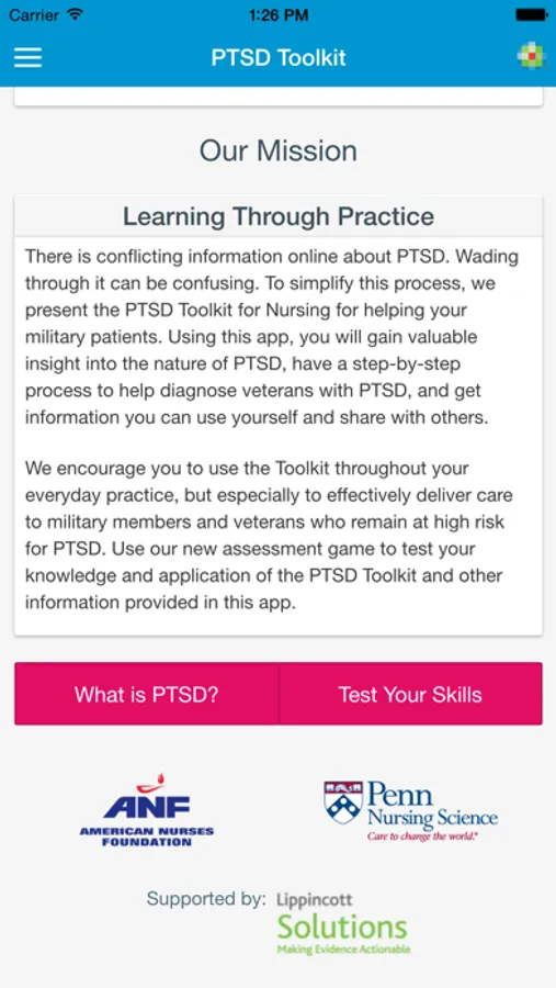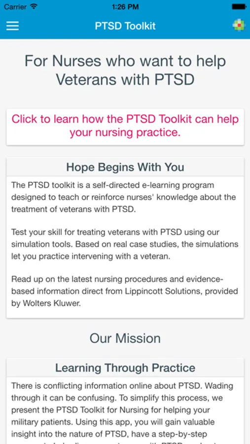 The PTSD Toolkit App is a FREE e-learning resource for nurses for treatment of veterans with post-traumatic stress disorder, providing clinical information combined with interactive simulations. This resource was developed by the American Nurses Foundation (ANF) and Penn Nursing Science, and was made available as a mobile application in partnership with the Lippincott Solutions team at Wolters Kluwer.