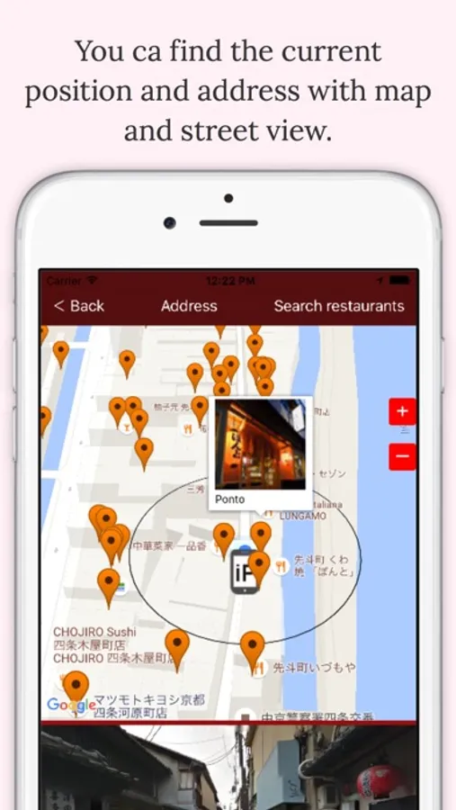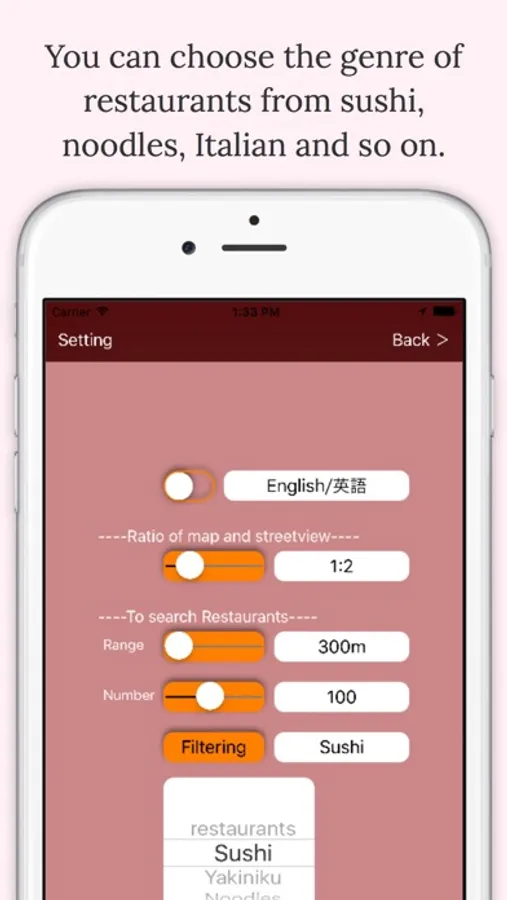 7 You can choose the range in search of restaurants from 300, 500, 1000, 2000, 3,000 meters in setting screen.