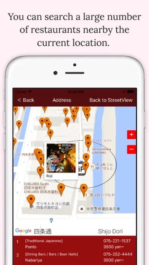 At the same time, with only one-button, the neighboring restaurants are searched and are displayed on a map. The table of the restaurants is displayed with a street view screen by turns. You can set a genres of the restaurants,result number of restaurants and search range beforehand.