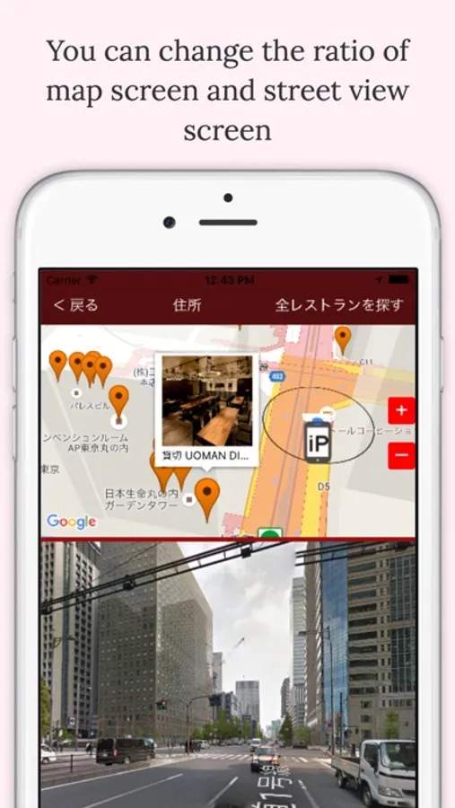 3 The table and the markers of neighboring restaurants are displayed when you push the button of switch. You can return to an original street view screen when you push the same button once again.
