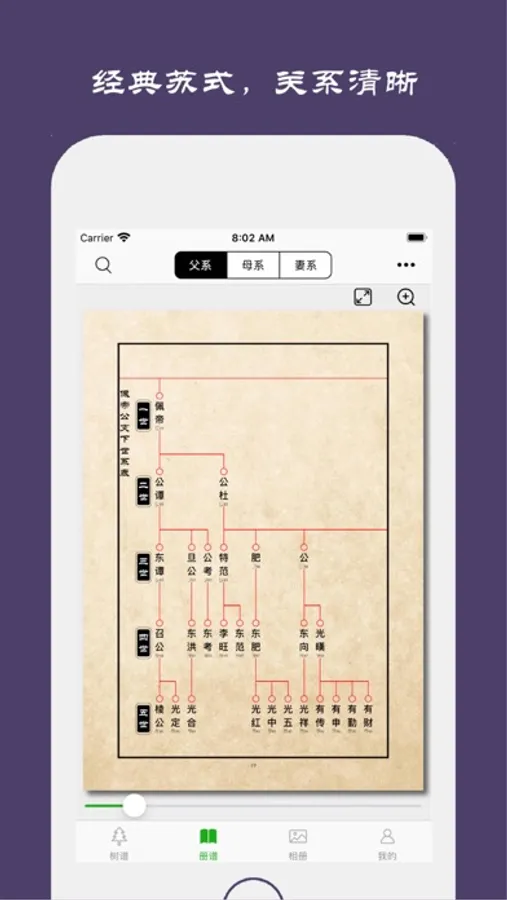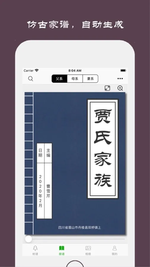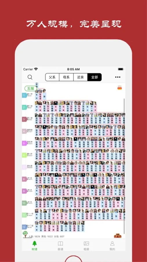 ● 修建电子族谱,传承家族荣耀。完美的家族树展示,独创称谓自动计算功能,让您可以清晰的查看五服内所有的关系脉络。"父系""母系"家族树完美的展示了具有共同祖先的所有子孙。