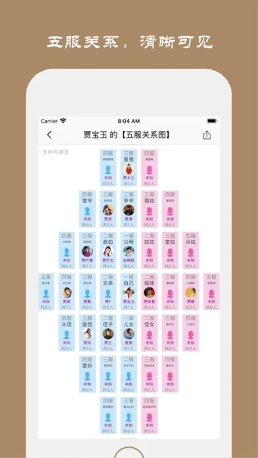 ● 快速浏览五服关系。切换中心后可以方便的浏览本人的五服关系脉络。