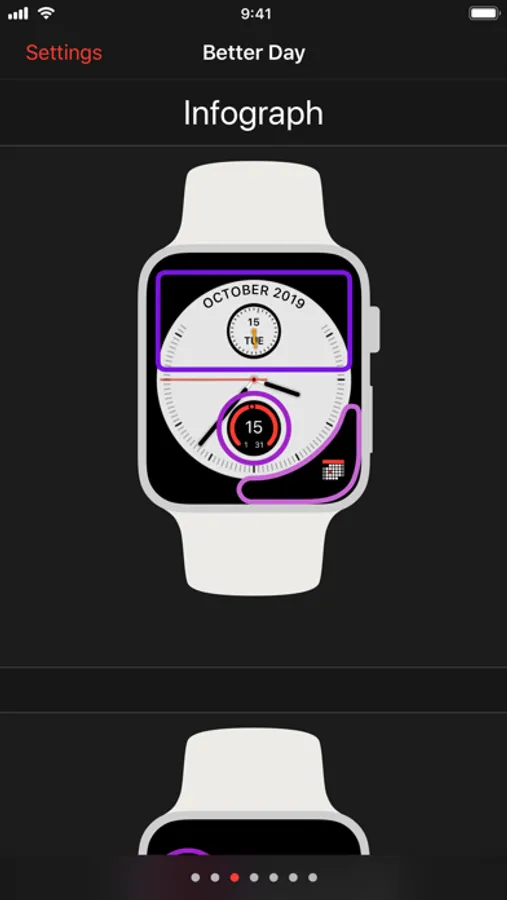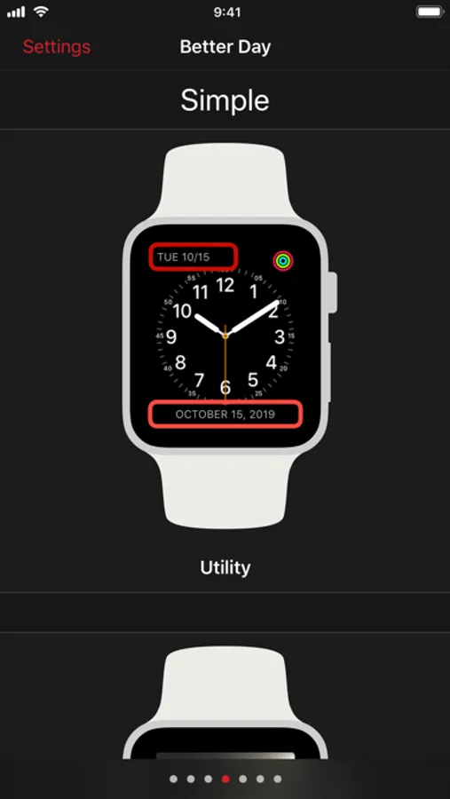 Better Day includes an awesome date complication. By default, it displays the weekday, month and day. You can configure the complication to display whichever part of the date you like, or a small graphic of the current month. For multicolor watch faces, you can also change the accent color.