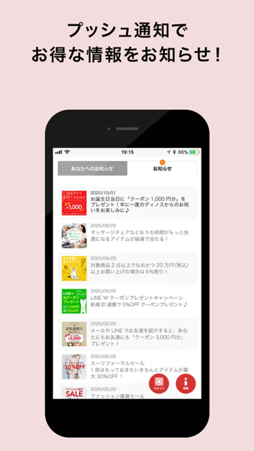 お得な情報をプッシュ通知でお知らせします。アプリの初回起動時にプッシュ通知を「ON」に設定するようお願いします。