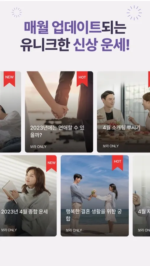 보라에 처음 가입하셨나요? 신규 회원이라면 누구라도 첫 운세를 무료로 체험할 수 있어요.