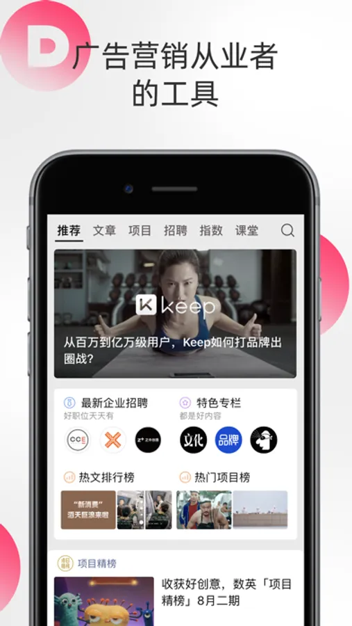 这里吸引了行业顶尖广告人才,成为每天上班必打开的工作助手;这里是国际国内一流的广告代理商:奥美、DDBO、Cheil、蓝色光标、电通安吉斯、GroupM、阳狮集团、盛世长城、李奥贝纳、HAVAS汉威士集团、McCann麦肯、明思力集团、胜加、天与空等企业发布作品及交流平台;这里是来自中国及世界500强的企业:阿里巴巴、淘宝、天猫、网易、腾讯、京东、中国银联、华为、Nike、麦当劳、苹果、肯德基、支付宝、抖音、快手、爱奇艺、知乎、聚划算、方太、奔驰、宝洁、滴滴、杜蕾斯、伊利、饿了么、小米、大众汽车、汉堡王、QQ等,他们最新的、最热的品牌营销项目、新产品广告案例的重要发布渠道。
