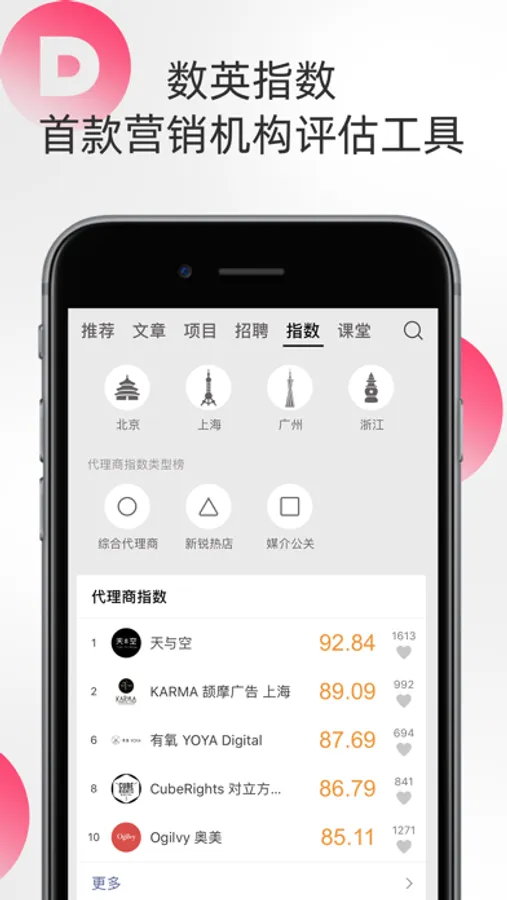 入驻近万家企业帐号基于在数英平台的活跃度、项目数、项目品质、人气、行业认可度等多维度数据综合得出的指数型工具。代理商指数用以评估代理商的综合实力,品牌指数用以量化评估品牌在创意、营销层面的声量与表现。
